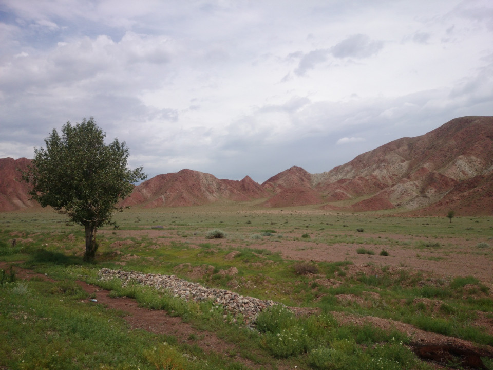 The area around me was at least something to look at. The giant mountains are fading away, but there are still a few cliffs and large hills to enjoy. The valley also began to get tighter and tighter. Soon I was riding through a wonderful little canyon. I even found a great little place to camp. It was down a steep slope from the highway and right next to the Chu River. I could hear the big trucks sometimes, but for the most part it was just me and the river.-Dravis