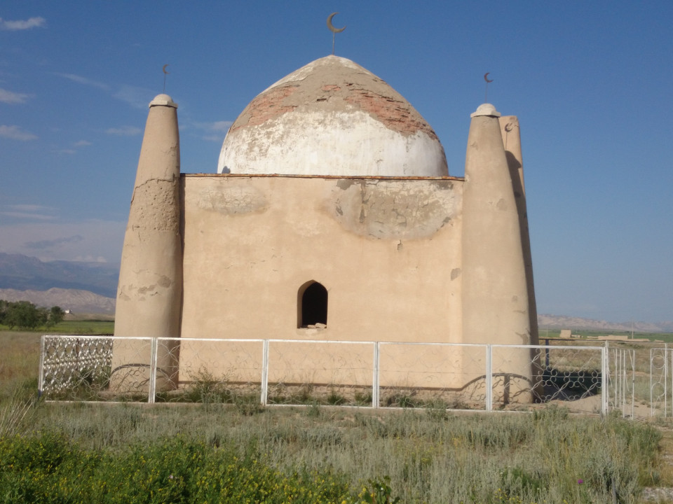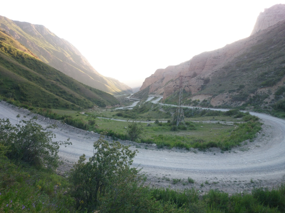 Outside of town, I stopped to take a picture of another group of tombs near Ak-Tal. There were a few guys there already who wanted to talk. It turns out they are architects doing a restoration on the tomb of two local princes. I was also told the president of Kyrgyzstan is coming in a few weeks and they want it to look nice for him. The tombs are called "Kymboz" here. The architects told me they were going to say a prayer, as was custom when visiting a mausoleum like this. I sat down, bowed my head, and listened to one of the guys give a beautiful chant from the Koran. I would have stayed longer to chat, but I really needed to put in at least a few more miles. The road meandered up a broad valley which wasn't that steep, but the incline did slow me down a bit. Again, the road surface was so bad I did a bunch of riding on horse trails just next to the highway. All in all, though, I was feeling really good. I was fully stocked to camp anywhere, the day was still sunny, the area was bright and beautiful. It was nothing too exciting, but just a nice ride.