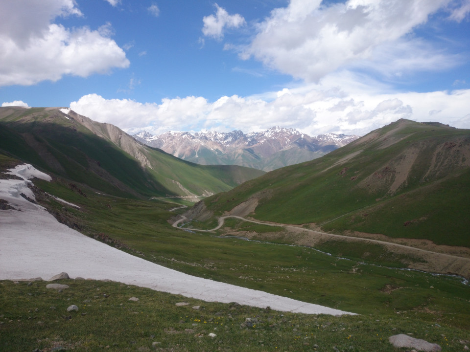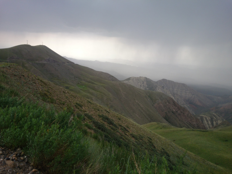I finally reached the top of the pass. Sadly, the view from the top was less amazing than the views from the road up. I was still a little impressed that it was a 3,300 meter pass, though.I didn't spend much time at the top. There were large black clouds looming in the valley I had just climbed up and I wanted to get a little bit of shelter before the storm hit. I was quite glad that the road from the top didn't descend down as steeply as what I had just come up, it was a nice grade down into the valley. The center of the storm actually passed me off to the left, but that was also the way my road headed. I decided to stop and wait out the rain. The first shelter I found was a road grader that was parked by the road. The people there said I could lean my bike against it and hang out underneath it out of the rain. That worked well for a bit. They even brought me some kumiz, which is fermented horse milk. The neighbors thought that wasn't good enough and invited me into their tent for food and tea. I didn't want to be rude, so I couldn't refuse. They were really sweet people and gave me way too much to eat. They also insisted that I couldn't leave without more food to take with me. I feel bad about taking food from someone else, but it was very much appreciated.