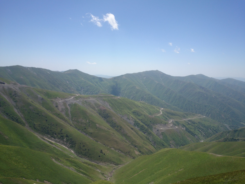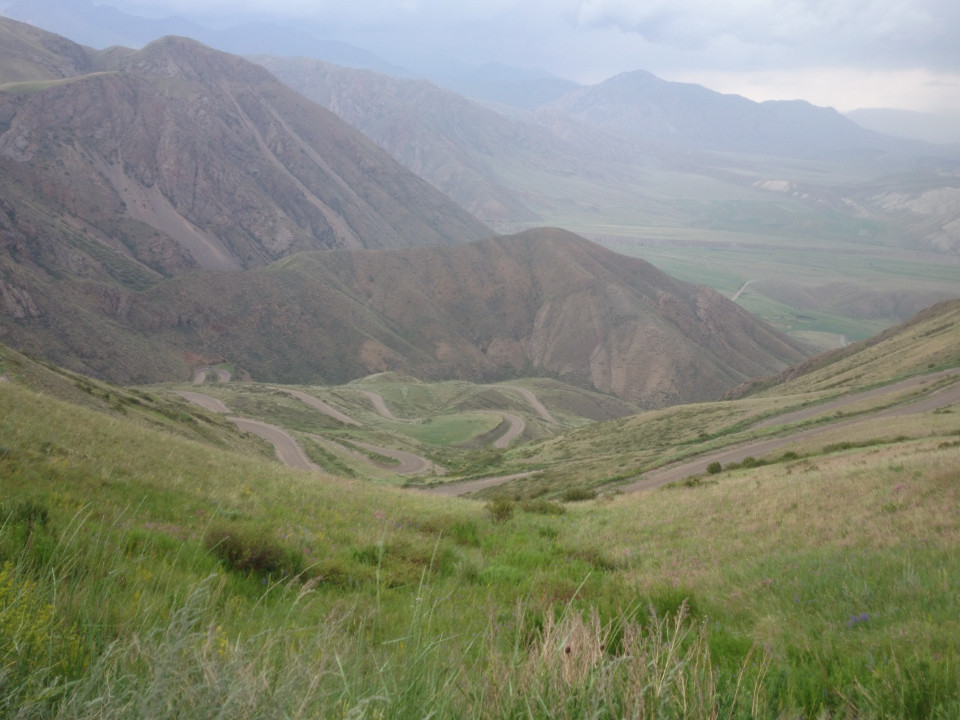Well, another short, tough day. It didn't help that the whole morning was spent climbing up and over a steep pass. I thought I was done with mountain passes, but I guess Kyrgyzstan has a few more left for me. This one climbed 1,200 meters in 17 kilometers, so do the math on that and it comes out to about a 7% grade the whole time. The road wrapped around the shoulder of a mountain as it snaked its way to the top. Looking at the map, the road appears like a crazy squiggle. It wasn't bad, it was just slow. It gave me a lot of time to enjoy the view. It was a stunning view, looking back on the tiny curve of road down below. At the top, there were even eagles playing in the air currents. These are big birds. It was fun to watch them soar overhead.