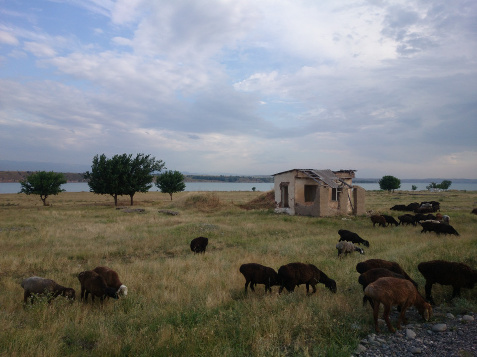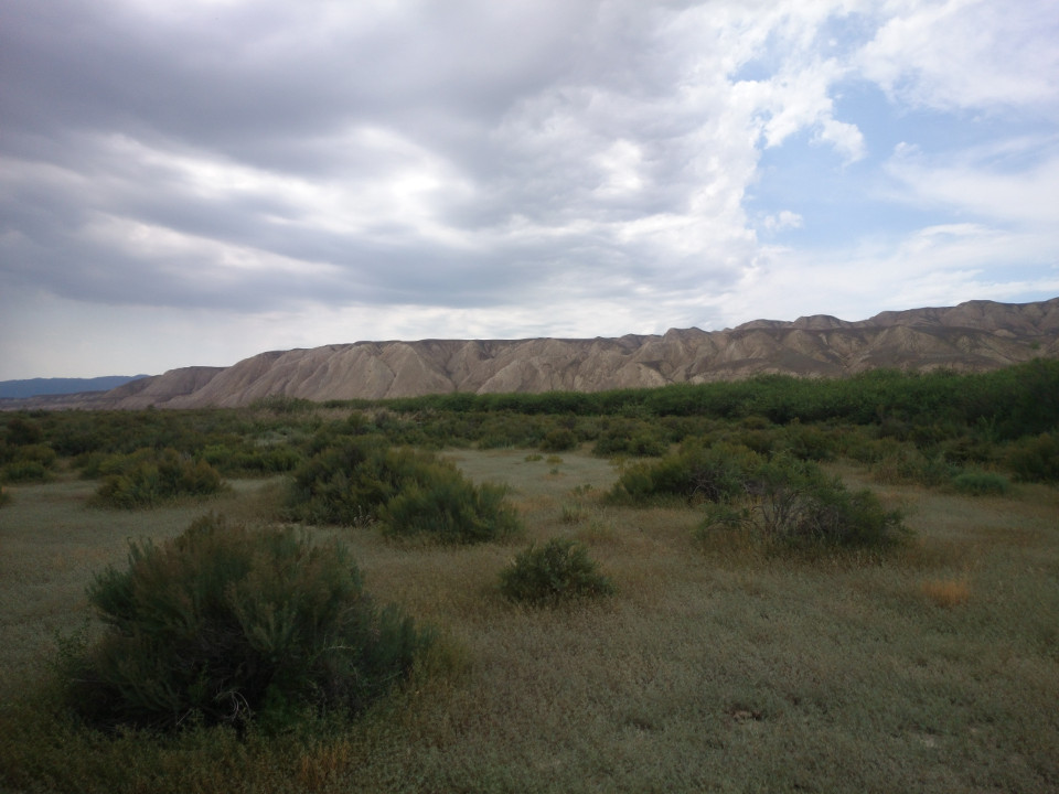 Leaving Kochkor, things were cool and cloudy. There wasn't a whole lot of wind, though. I was pretty thankful for that. There was one route that would have taken me more directly to Bishkek, but I was hoping to see Issyk-Kul. It's the largest lake in Kyrgyzstan. I really don't know when I'm going to be back in this part of the world, and it would be shame to miss it. The road out there was pretty flat. I was riding through more dry, rocky valleys. For me, they were more evidence why the herds are moved up into the mountains during the summer. There wasn't much grass here, just tough bushes and brambles. This isn't an area that would support herds of large animals.