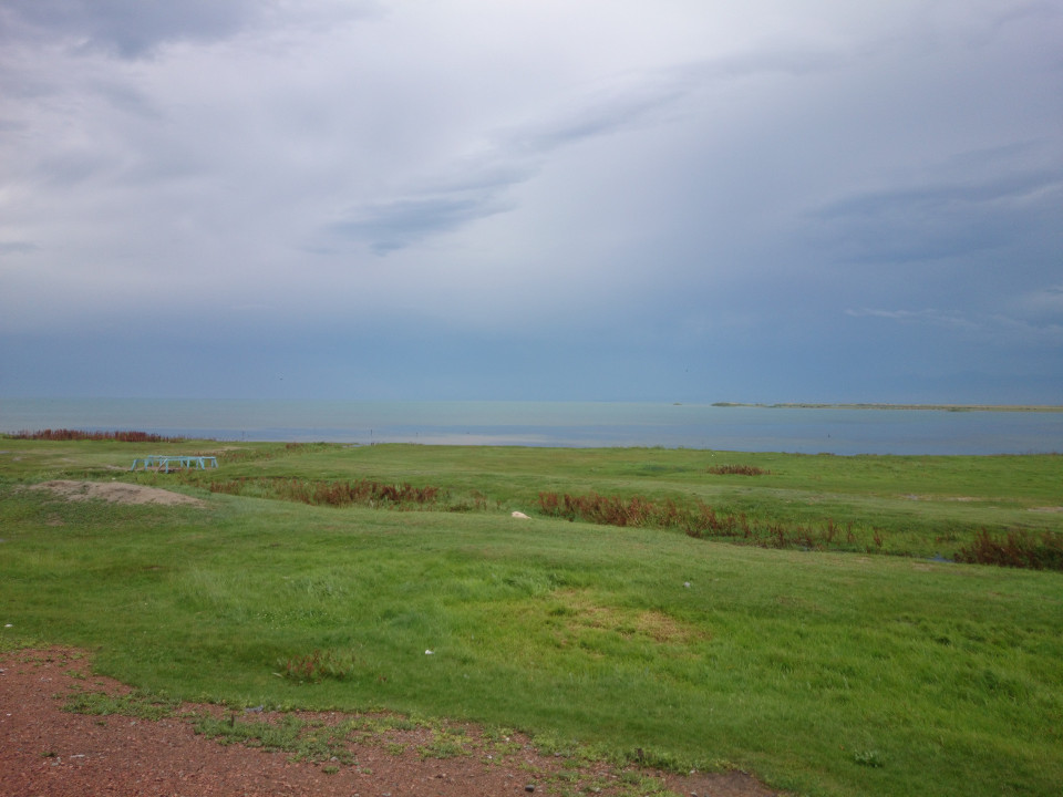 The winds began to pick up as I entered the town of Bilikchi. I knew what that meant. I headed into a little cafe to have some food, and sure enough a huge storm blew through. I was quite happy to be inside for that. Afterwards, I headed down to the lake shore. It took a while to find, but when I arrived it was well worth seeing. The surface was reflecting the color of the clouds above. The water and sky seemed to mix with hardly a line in between them. Heading out of town I had a bit more trouble. The rain had gone, but it had left a strong wind behind and I was heading right into it. I was still making good time, since even with the wind I could do more than 15 kilometers an hour. It wasn't fun, though. Riding in a stiff wind is like pedaling in syrup. It takes so much energy out of you. The highway I was on wasn't that appealing either. It was a two lane divided highway with a good shoulder. So it was pretty safe, just not fun. Big trucks and cars were roaring by. On the rough roads I have gotten used to cars lumbering by slowly. Here, everyone is zooming around. There isn't any peace and quiet. It actually reminds me of the highway leading out from Istanbul.
