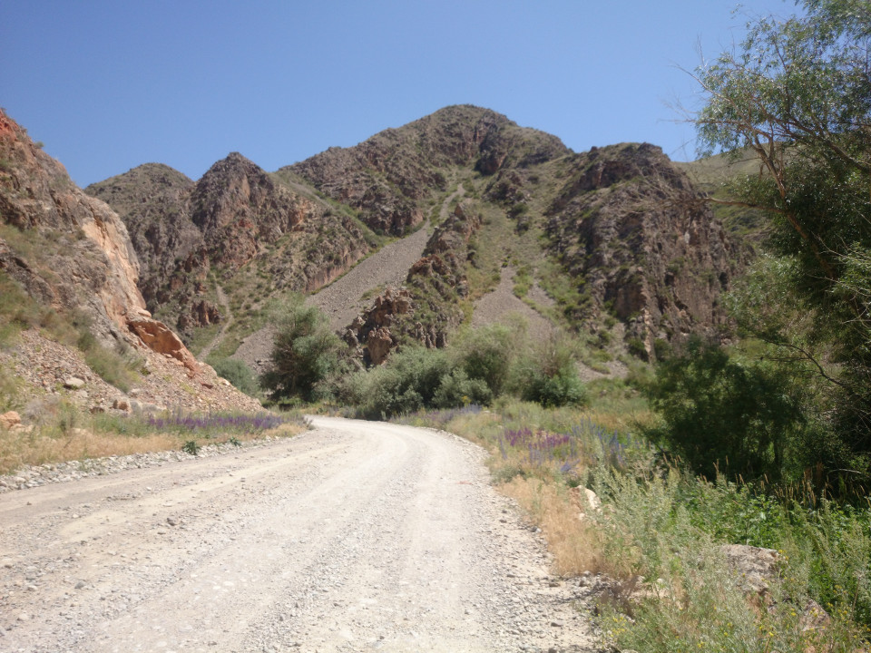 Today's list of grievances: the first part of the day, leaving Kazarman, was actually pretty flat. It was also one of the worst roads I have been on in a while. Even on bad roads I can usually find some kind of path. Probably not anything great, but at least passable. Usually this involves riding all over to find a place where the road is smooth and well packed down. It wasn't possible here, though, this road was horrid. Alternating bands of washboards and piles of loose, round gravel. Neither one made for a good option. Not much I could do, though, just keep pushing forward. It couldn't last forever, right?