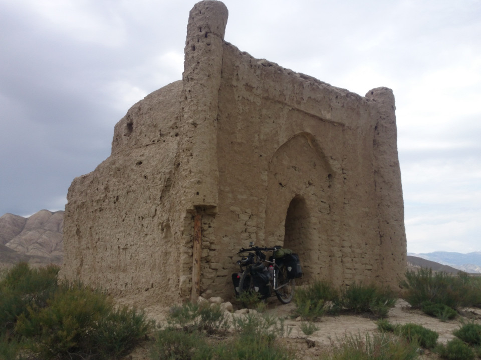 I'm glad I went back on the road, because I saw an old mud-brick tomb off to the left. I wanted to get a closer look, but that was certainly not easy. The area on the left side of the road was even more swampy than the right. It took some time to find an old road that went in almost the right direction. Once that road died, I was back to whacking a trail through the brambles. I don't know why I bothered to bring my bike with me, it just got stuck in the weeds and branches. When I finally got to the place, it was simple and falling apart. The main dome had collapsed. The outside was cracked and broken. It was a beautiful place for a tomb, though. The spot was on a little hill surrounded by swamp. It was very peaceful and beautiful. After wasting a bit of time, it was time to head back to the main road. The highway continued to suck, but I met a couple of cyclists on the way. The first was Italian, the second Canadian. It was good to get a little information about the road ahead. They told me there was one more large pass up to Song Kol, which I had figured there would be. I also warned them about the big pass coming up and the lack of water there. We cyclists have to look out for each other.