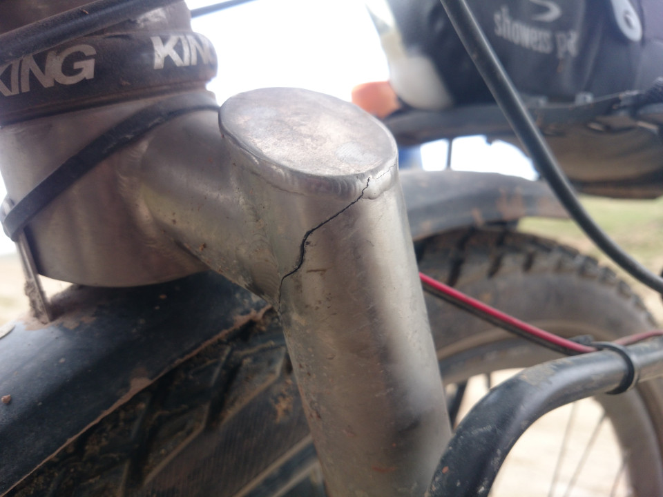 The ride down also gave me a good amount of time to do a few things. The first was to enjoy the beauty of the place. The mountains are remote and jagged. Often the road is stuck to a narrow ledge between a cliff and a sheer drop down to the river below. The second was to rethink my annoyance at finding the crack in my bicycle. I realized it was so much better to have found it when I did. If I hadn't seen it and continued down the mountain in my normal way, it would have been very possible to have the fork fail at some very high speeds. The last thing I wanted to do was watch my front wheel go flying off while sailing down a mountain in Tajikistan. I couldn't help but look around me and imagine such an accident throwing me over the cliff and down into the rocks and rapids below. My third thought was how well the fork must be made. I can't say for sure what caused the crack, but I don't think it was recent. The only major thing that happened was the damage caused by the airline on the flight over. It got me thinking about all the mountains and passes I have been through in the last five months. The fork could have broken coming down any of them and it would have been just as disastrous, but it didn't. I would like to thank the guys at Ren who made the fork. In spite of the damage, it never sent my head into the ground, never tossed me off a cliff.