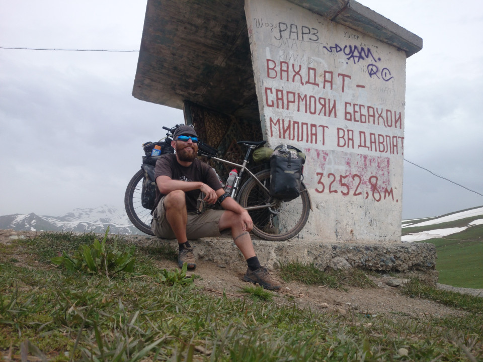 Finally, I reached the top of Khaburobot pass. At the summit was a small bus shelter that listed the elevation at 3,252 meters. Not too shabby. I stayed a while at the top. Not that there was much to do, but I needed some food and a little rest. I also needed to make a plan. I could have waited for a car heading down the mountain, but that would sort of ruin the whole trip. I want to do the whole journey by human power. There also weren't many cars coming along, and none of them were going the way I was. Instead, I decided to continue to ride the bike and get it to the next big town at the bottom of the pass. Once I had finally made the decision, I set off towards Kalaikhum. I should note, here, that this is not a good idea. No person reading this should ever try riding down a mountain on a broken fork, it is super dangerous. I did my best to keep things at least a little bit safe. I kept my speed down to what I thought wouldn't hurt too bad if the fork snapped, which turned out to be about 12 kph. So the trip down was not fast. Because I was using my bakes so much, I also had to keep stopping to let them cool down. That didn't make the day go by any faster. These stops at least gave me chances to check the crack to see if it was expanding, and fortunately it was not progressing any further from the point when I noticed it.
