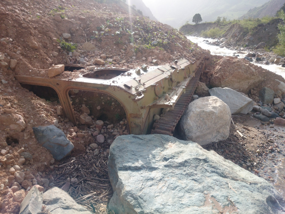 At one point I stopped for water and noticed an unusual rock in the water. The more I looked, the more I realized that it was not a rock at all. It was, in fact, the turret of an armored vehicle. I wondered how that had gotten here. Looking around, I found the rest of the vehicle. It was almost completely buried in the river bank. Still, the tracks were visible on one side. The back door was open, revealing it to be almost filled with dirt and rocks. This was a reminder that there was a bloody civil war here after the breakup of the Soviet Union. I had not seen any other signs of the conflict. There weren't many burnt out homes or buildings, but this giant steel monster rusting away up here gave me an indication of what must have been going on.