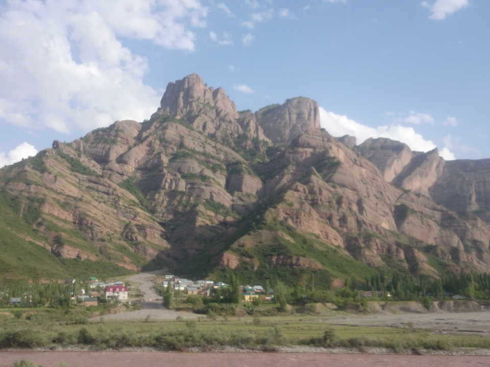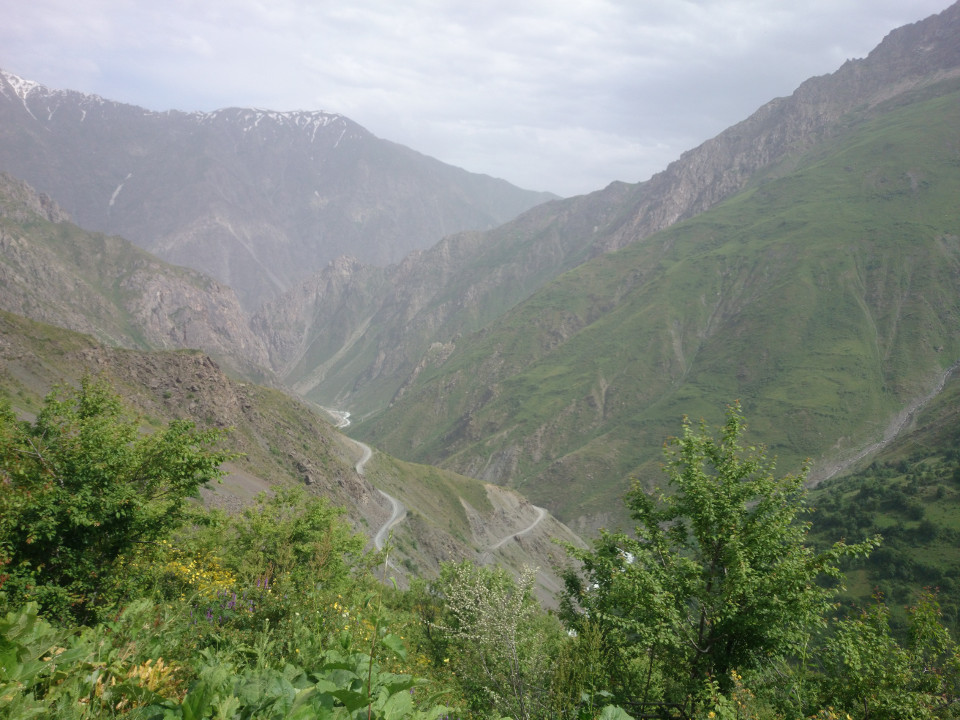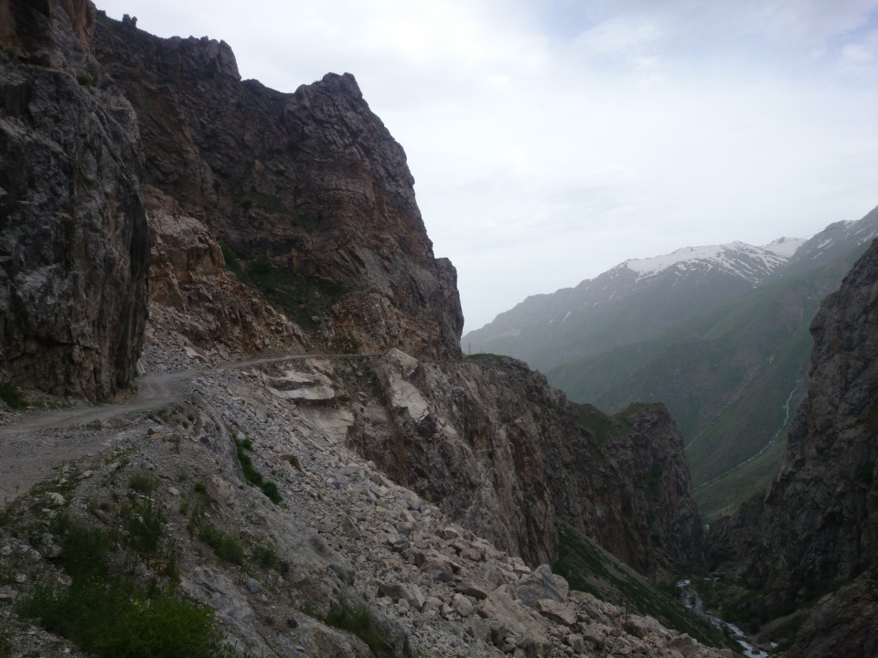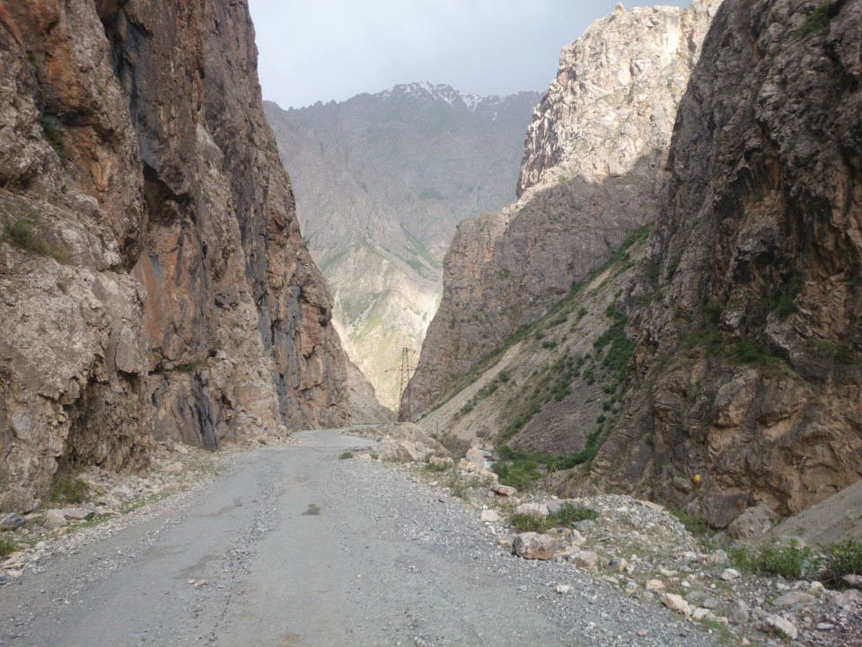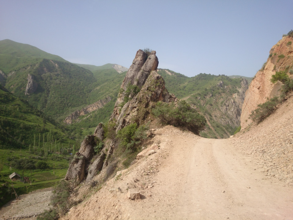 I woke up bright and early in the morning, and Muhammad soon brought in breakfast. I thought I might see the rest of the family, but in spite of my early start Muhammad's father had already left. Breakfast was wonderful. Again, it was a big selection of food. I tried to eat as much as I could so as not to be rude, but they served way more than one person could eat, and kept bringing in more. It was a really lovely meal. Afterwards, I said goodbye to my hosts. I wish them the best of luck. Leaving Faizobod, the road climbed over one large ridge, and then a second. The area was beautiful, more rocky river gorges. In many places the road was stuck between steep hills on either side. One looming above, one dropping down into the river.