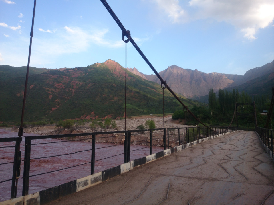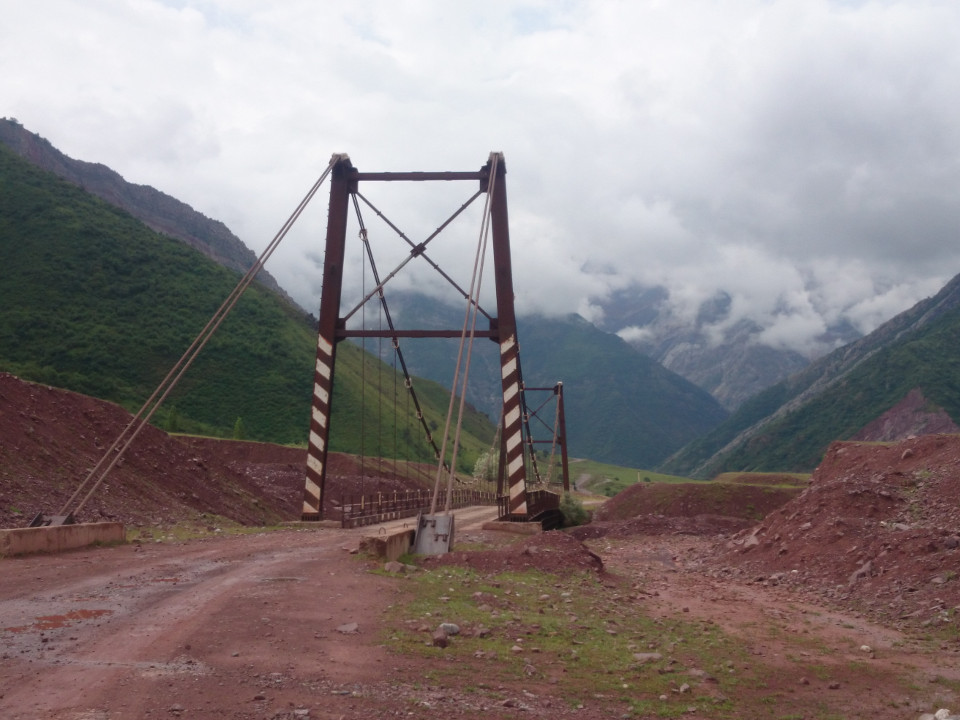 Eventually, I found the river crossing I was looking for. There was a suspension bridge crossing the torrent. The road then crossed a side stream, but this had no bridge. Since it was close to dark, I was looking for a way to cross on dry land. That wasn't an option. Fine. So I plunged right in. My feet were wet and the water, at points, came up almost to my knees. On the other side of the stream was a small village. The young men were playing volleyball on the edge of it. (Volleyball is really popular in this area. I wonder if that is because it takes up less space than a soccer field?) Just as I had reached the other side of the stream, one of the players hit the ball a little too far. The volleyball bounced a few times before hitting the stream, where it made a direct line down toward the large river. The volleyball players began shouting. I put the bike down and ran after the ball. Hell, my shoes were already wet. I was able to grab the ball just before it floated out into the main channel. The volleyball players were very happy that they hadn't lost it. I wonder how many they must lose in a year?In the village was the first police checkpoint. This was where my GBAO permit came in. The officer there was nice and relaxed. He didn't ask any questions, just wrote down my information and let me go. I still had a little bit of daylight left and wanted to make up a few miles because it had been a slow day. I was also hoping to find a small stream or a place to get clean water. The sun was soon setting, but I didn't see many good spots. It was mostly steep slopes into the river. Soon enough, the road turned away from the river and headed up hill. Now the slopes were even steeper, I still didn't have water to drink, and it was dark. Whoops.