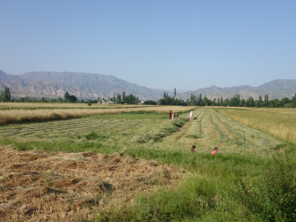 I came to a small village and saw a young boy carrying what I thought was water. I asked him, but it was actually milk. He told me there was some water nearby. I went with him over to what turned out to be his grandparents' house. While I was getting water from their tap, they invited me in for dinner. Again, who am I to refuse? It was very nice, but I felt a little bad because the men and boys ate with me, but the women ate in the other room. I don't know if they always do that, or if it was just because I was there. Either way, the food was good, and they even offered to let me stay there. In the main room they had a metal spring bed, probably from Soviet times. They didn't think it was good to use. Instead, they set me up with some mattresses on the floor and some nice warm blankets. (At night in the mountains, things were getting chilly.) I just found it startling that they had a bed, but didn't use it. And yet, they kept it around for some reason. In any case, I was fed, warm, and dry. It is amazing to me how often people here have been inviting me into their homes.