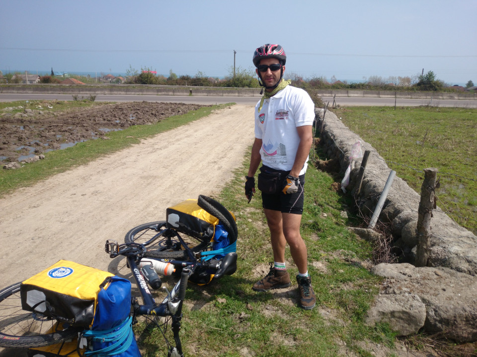 Mid-afternoon things started to change yet again. The weather became cool, and I was riding among some large green hills. Still mostly flat, but at least it was something to look at. The flat didn't last. In short order I was riding up and down those hills. Oh well, I would take hills and an interesting view any day. The landscape might not have been flat anymore, but one thing was. My back tire was slowly leaking. I thought of fixing it but I had less than 20 kilometers to go until my destination, so I just pumped it up and made it all the way to Astara.