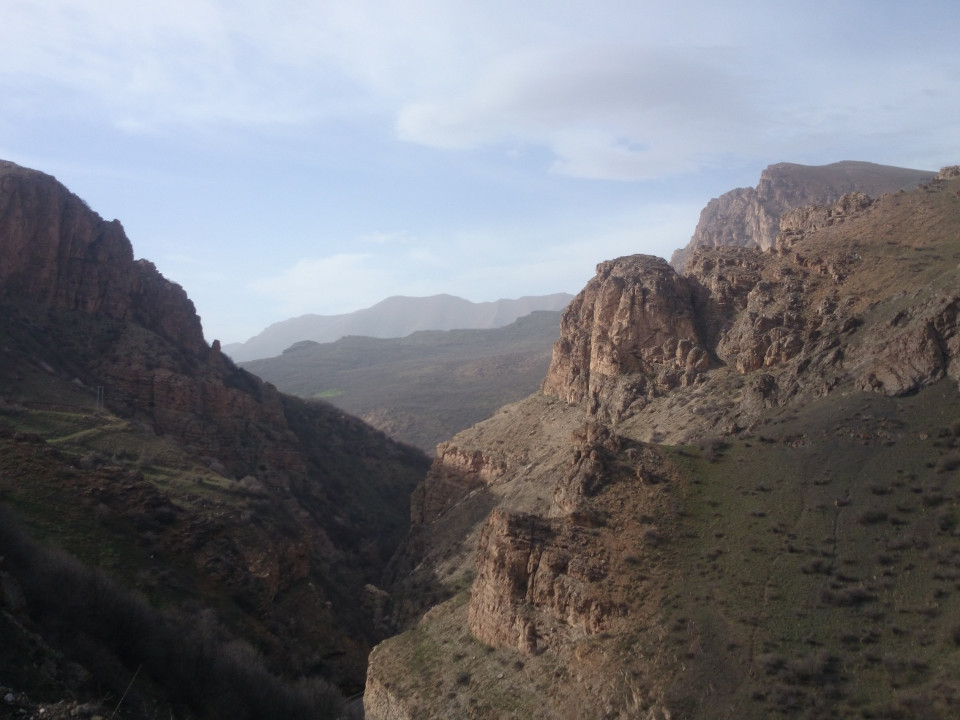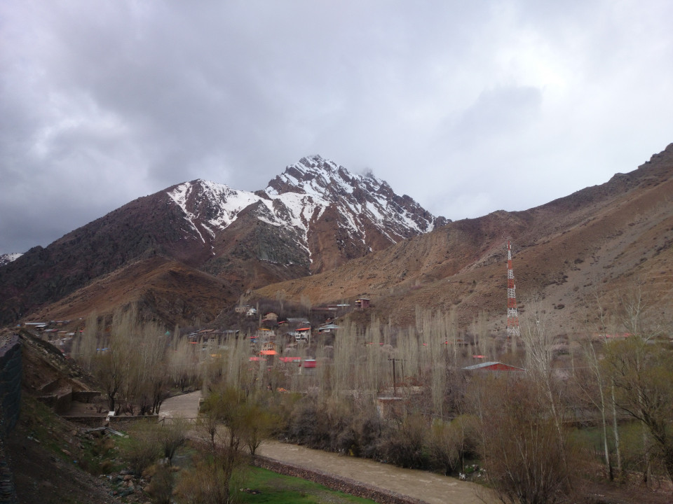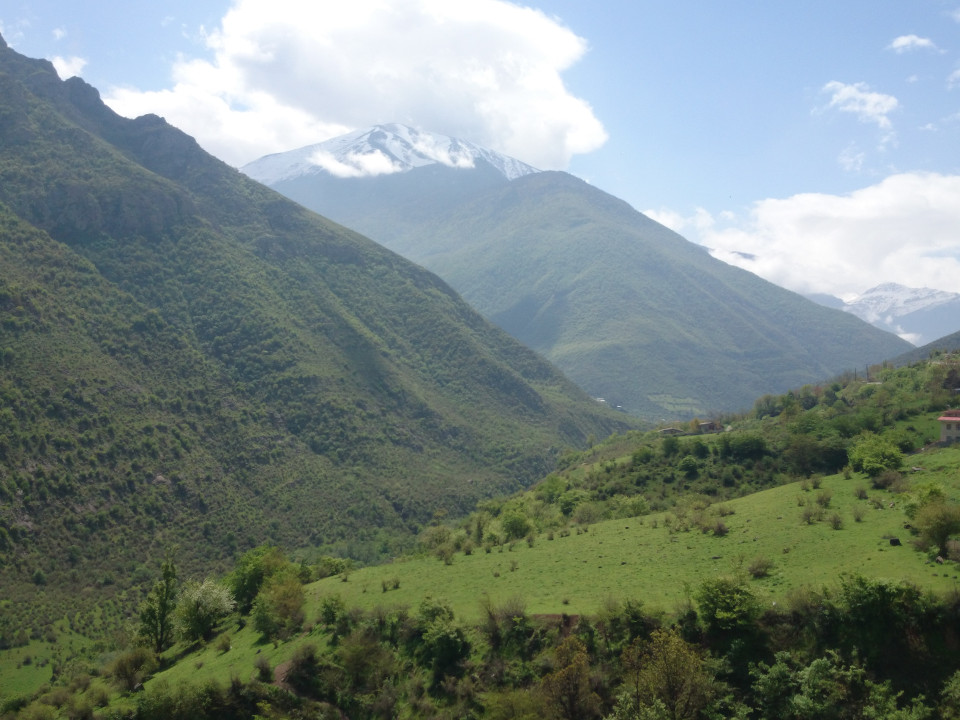 It was raining as we left the house. That continued for the next couple of hours. It was still an amazing day, though, in spite of the rain. Iran is gorgeous. I always thought taking pictures in Iceland was cheating because of the natural beauty all over the place, and I might add Iran to that list. Everywhere I looked there was something amazing to see. The road we were on wandered up a narrow river valley. Cliffs and steep mountains lined both sides of the road. The clouds hung low, casting a mist over the upper reaches.The rain let up before noon. Darius and I were really getting into the hills at that point, and all I can say about it is "wow". What impressive landscapes. The trees were almost glowing green in the spring sun. The mountains around us were rising up like giant sentinals. Ahead, up the river valley, I could see the white capped peaks that I would be heading through soon.