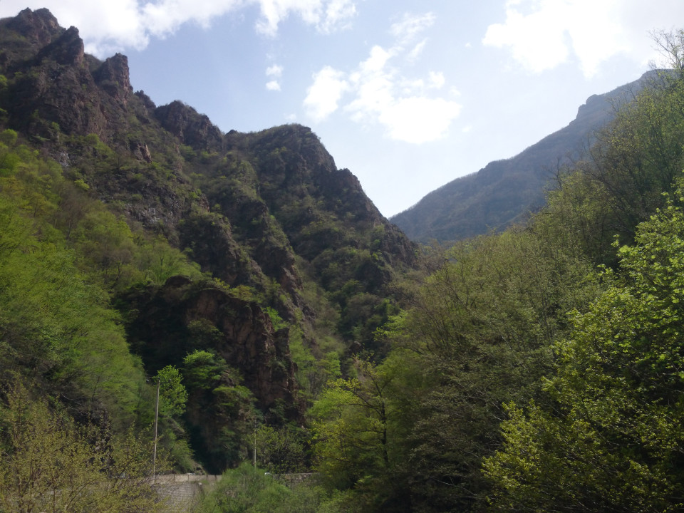 After lunch the road cut through this narrow canyon. Cliffs hundreds of feet high loomed over me as I rode along. The road was even cut underneath the rocks in the truly narrow parts. I couldn't belive that this road actually existed. I kept marveling that someone had the guts to build a road here. Not that I was complaining. I took some pictures and video of the place, but it probably doesn't even come close to describing how awesome it is to actually be there. It is hard to capture what it feels like to have walls of rock looming over you on both sides, to look up and see the textures in the stone going up as far as you can see, seeing how the orange and red color of the rocks contrasts with the bright green plants in the spring sunshine. It isn't an experience that I'll forget.