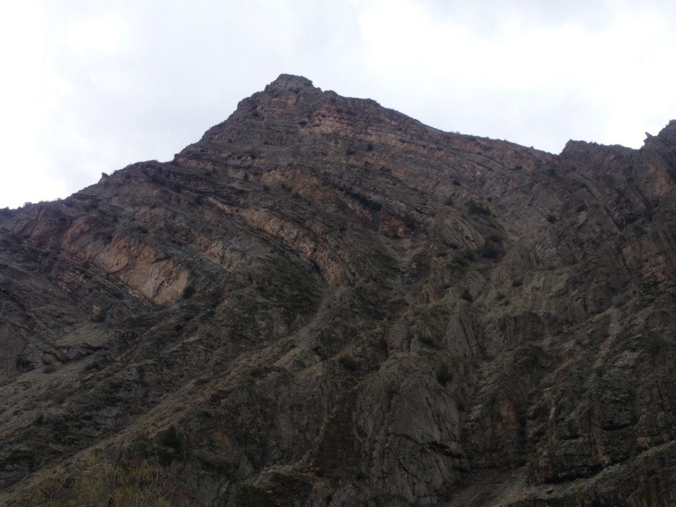 Outside the settlements, things became even more stark. With few trees, and even fewer showing green leaves, the landscape was a jagged moonscape. Rocky crags loomed on either side of the valley. Some peaks were capped with a layer of snow, but most were bare. Often, the hills were topped with rocky spires, or ridges that looked like the edge of a knife. Many of them showed the layers of rock that made this range. It was unusual to see one that was actually horizontal. The bands of stone ran at all angles. Even two mountains next to each other would have their strata at radically different pitches. More than a few showed the once flat layers that had been bent into curves. It is hard not to think about the violent geological procress that must have jumbled up the pattern of sediment here.