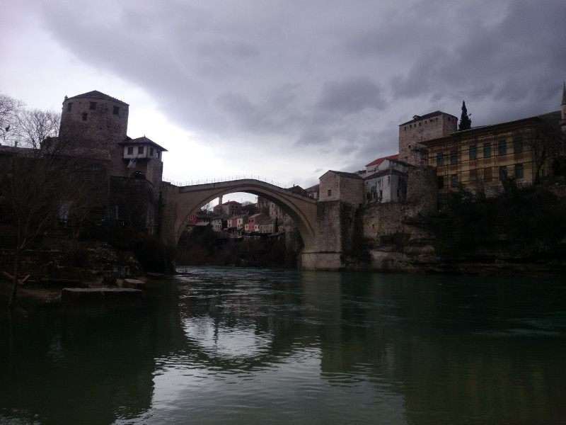 This morning I got up early to check out the town. I was going to walk around it briefly before leaving for Sarajevo. When I started touring the town, though, I found I didn't want to leave. It is a very pretty place, bounded by steep mountains on all sides and cut through by the river Neretva. The old town skyline is all slate roofs and minarets, and in the end I decided to take another rest day to enjoy the town. I am still ahead of schedule, and how many times will I really get to come to Mostar? I think the thing that really convinced me to stay was the smell. It took me back to my time in the Atlas mountains of Morocco. It is a combination of fragrances from wood smoke, and cooking onions and spices all mixed in with cool wet mountain air. I couldn't get enough of it. On the subject of smell, though, I forgot how much people smoke out here, all over the place. In restaurants and cafes and bakeries, everywhere. While the smell outside in Mostar was great, the smell inside most places was not. It sucks to walk into a place and come out smelling like an ash tray. But I digress.