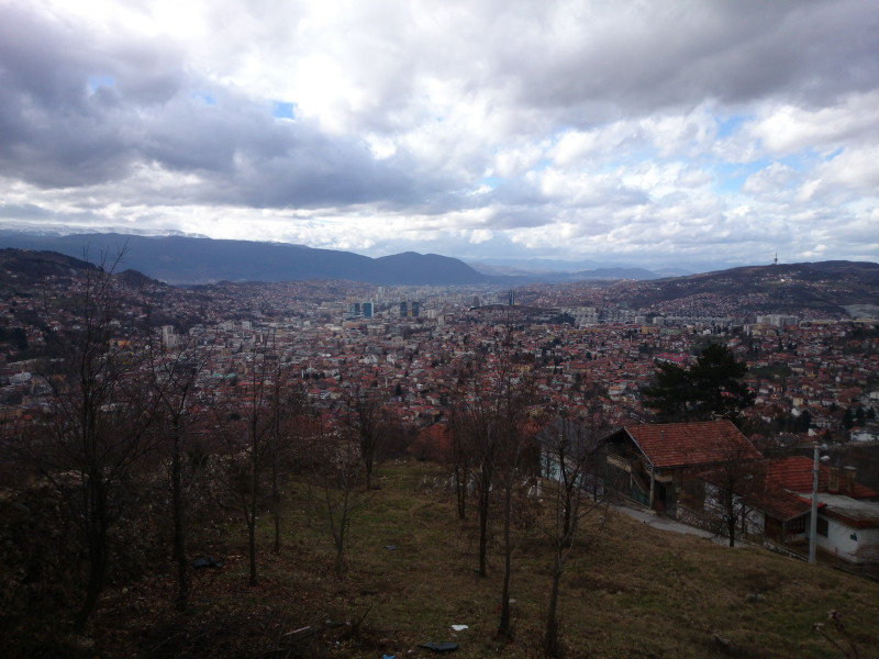 Soon enough the road began to level out. The snow also started to disappear, and before long it was gone entirely. That is when I really started to cruise. I was just ripping along those dirt roads. Then I was back on the paved highway. I had only done about one third of the distance for the day, though, and spent almost two thirds of the day doing it. I raced down into Konjic feeling pretty good, but I knew there was one more big mountain pass for the day. The good news was that it was paved, and there was no snow. It also wasn't nearly so bad as the first big climb, only about two thirds of that. (I say only, but you try doing a two thousand foot ascent.) I hit the top just about sunset. I didn't want to repeat what happened in Mostar and come into Sarajevo at night, but I did. Such is life. Sarajevo might also be one of the most frustrating towns to get into. The highway I was on turned into a freeway for a bit right outside of town. I really wanted to ride on there, but no shoulder at night is not my game. Instead, I was running all over the back farm roads. None of them are straight, so it is a pain to navigate, and all of them are steep, winding over the tops of little hills. The whole time I could look down at the flat, straight freeway running along below me. I don't mind doing hills, I just hate it when there is obviously a better road that I can't take. Eventually I found my way back to the main road, which, adding insult to injury, had by this point turned back into a highway. That little section cost me over an hour. Even worse, about a mile down the highway there was suddenly a great bike line. I mean, that was nice, but where the hell was that when it really mattered? Sarajevo road engineers, I hate you.
