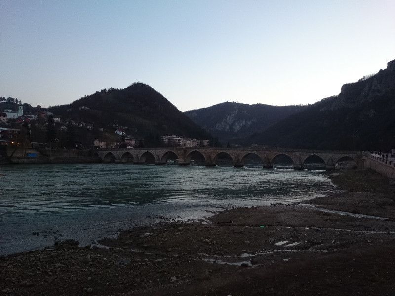 With the help of an old lady herding cows I did finally get onto the right road to Visegrad. That road still lead me up into the mountains, but at least it was paved. There wasn't any marking, but the road was good enough to seem like a highway. I started to get a bit discouraged as the sun began to set and I was still climbing. I know Visegrad sits on a river, so that wasn't going to be a thousand meters up a mountain. Then I hit the squiggles. I lost count of the number of switchbacks I went around. There must have been at least forty(?) coming down the mountain, which was awesome and annoying at the same time. I like screaming down a mountain and cutting into tight corners, but the turns here were covered in loose gravel. I couldn't just let go and whip around them, I had to go slowly so I didn't slide out and wreck. That meant burning off all that potential energy by heating up my brakes. And heat up they did. I had to stop about half way down to let them cool off. Any cyclists out there will know the distinctive smell of brake pads being used too much. In the end, the road was so much less fun to ride than it looked. Very disappointing. I can't recommend it.